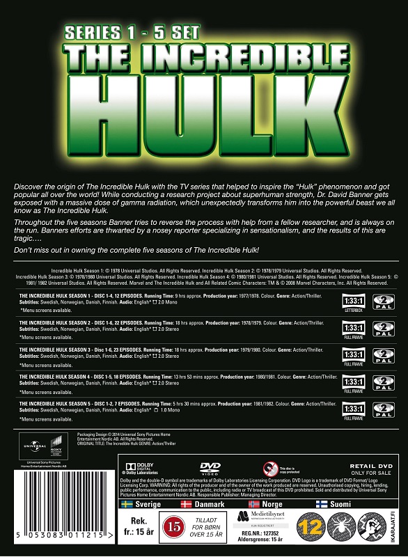 | Suomen kielinen nimi: | The Incredible Hulk Series 1-5 | Alkuperäinen nimi: | The Incredible Hulk Series 1-5 |