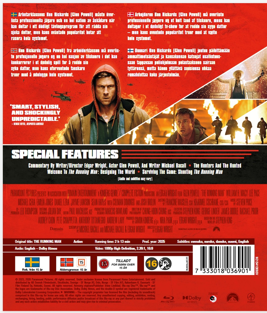 Commentary By Writer/Director Edgar Wright, Actor Glen Powell, And Writer Michael Bacall • The Hunt Begins • The Hunters And The Hunted The Runners — Self Tapes • Other Network Shows • The Apostle • Stunts Compilation • Hair, Make-Up And Costume Test • Deleted And Extended Scenes • Trailers & Digital Spots |