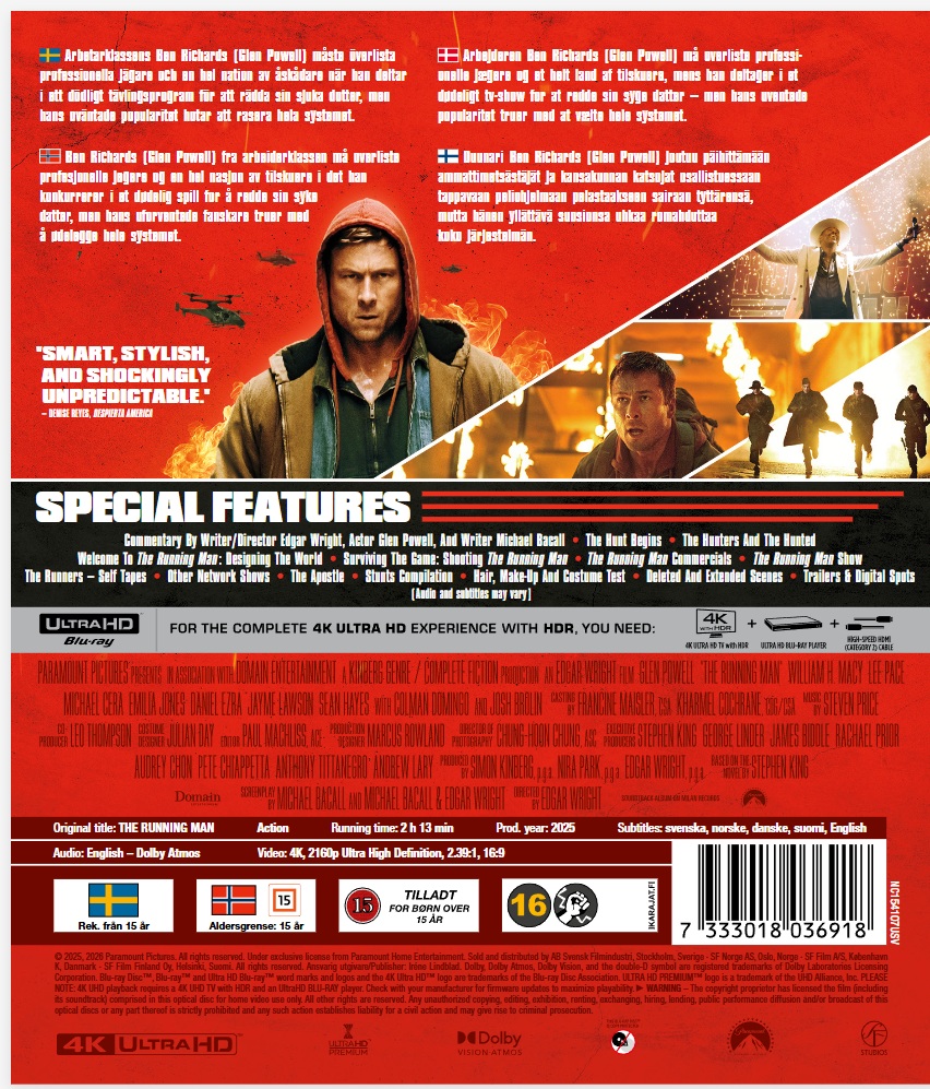 Commentary By Writer/Director Edgar Wright, Actor Glen Powell, And Writer Michael Bacall • The Hunt Begins • The Hunters And The Hunted • Other Network Shows • The Apostle • Stunts Compilation • Hair, Make-Up And Costume Test • Deleted And Extended Scenes • Trailers & Digital Spots |