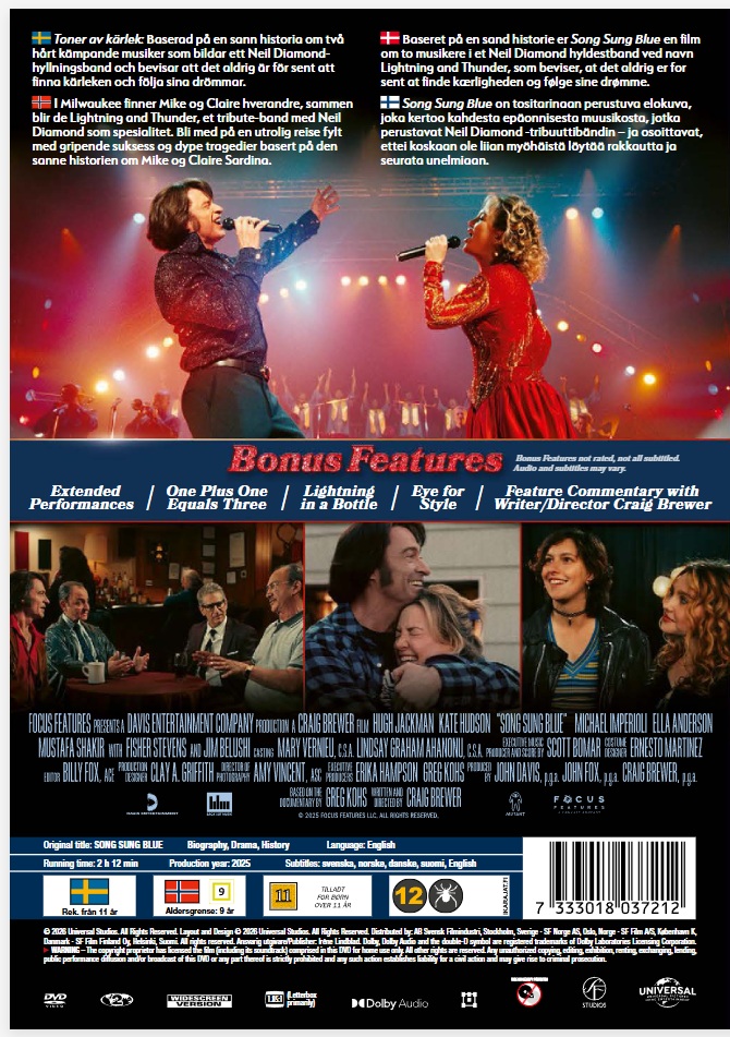 Song Sung Blue on tositarinaan perustuva elokuva,joka kertoo kahdesta epäonnisesta muusikosta, jotkaperustavat Neil Diamond -tribuuttibändin – ja osoittavat,ettei koskaan ole liian myöhäistä löytää rakkautta jaseurata unelmiaan.